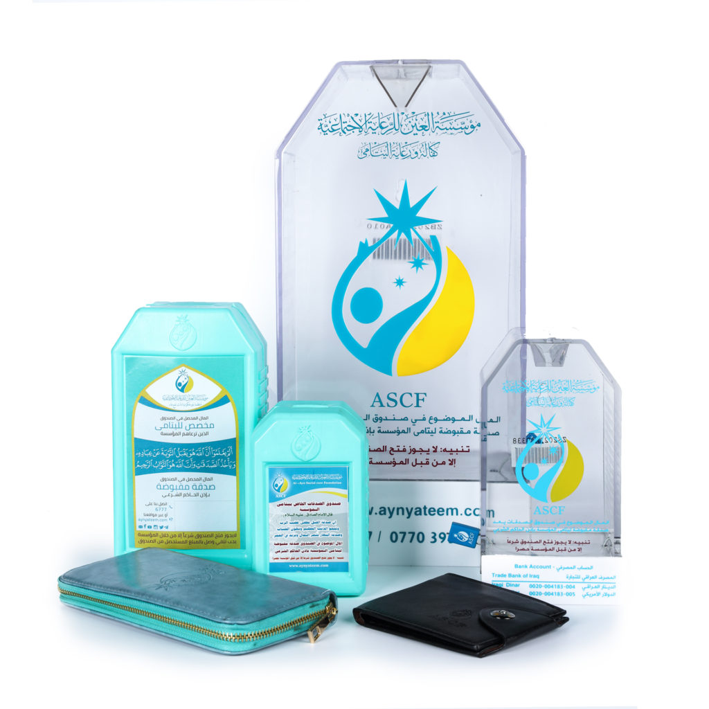 بدأت مؤسسة العين للرعاية الاجتماعية منذ عام 2010 بتصنيع صناديق خاصة للصدقات وسجلتها رسميًا في الجهاز المركزي للتقييس والسيطرة النوعية. وتُصنَع هذه الصناديق بأحجام وأشكال مختلفة لتناسب الاحتياجات المتنوعة لمستخدمي هذه الصناديق، فمنها ما هو شخصي ومنزلي، ومنها ما يوضع في الأماكن العامة. وتُصرَف الأموال المجموعة فيها على كفالة اليتامى غير المشمولين بنظام الكفالة الخاصة وعلى تقديم الخدمات المتنوعة الأخرى لهم من مواد عينية ورعاية صحية وتأهيل وإرشاد وتدريب مهني وتعليم.