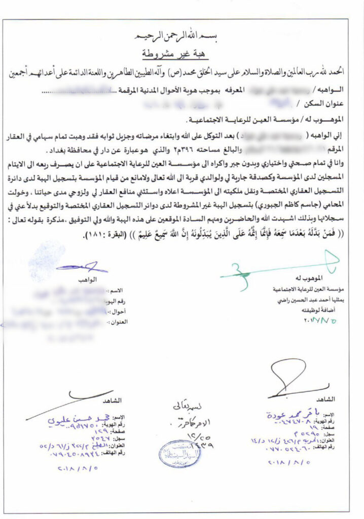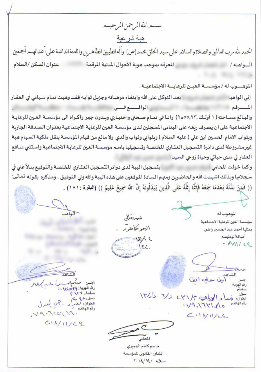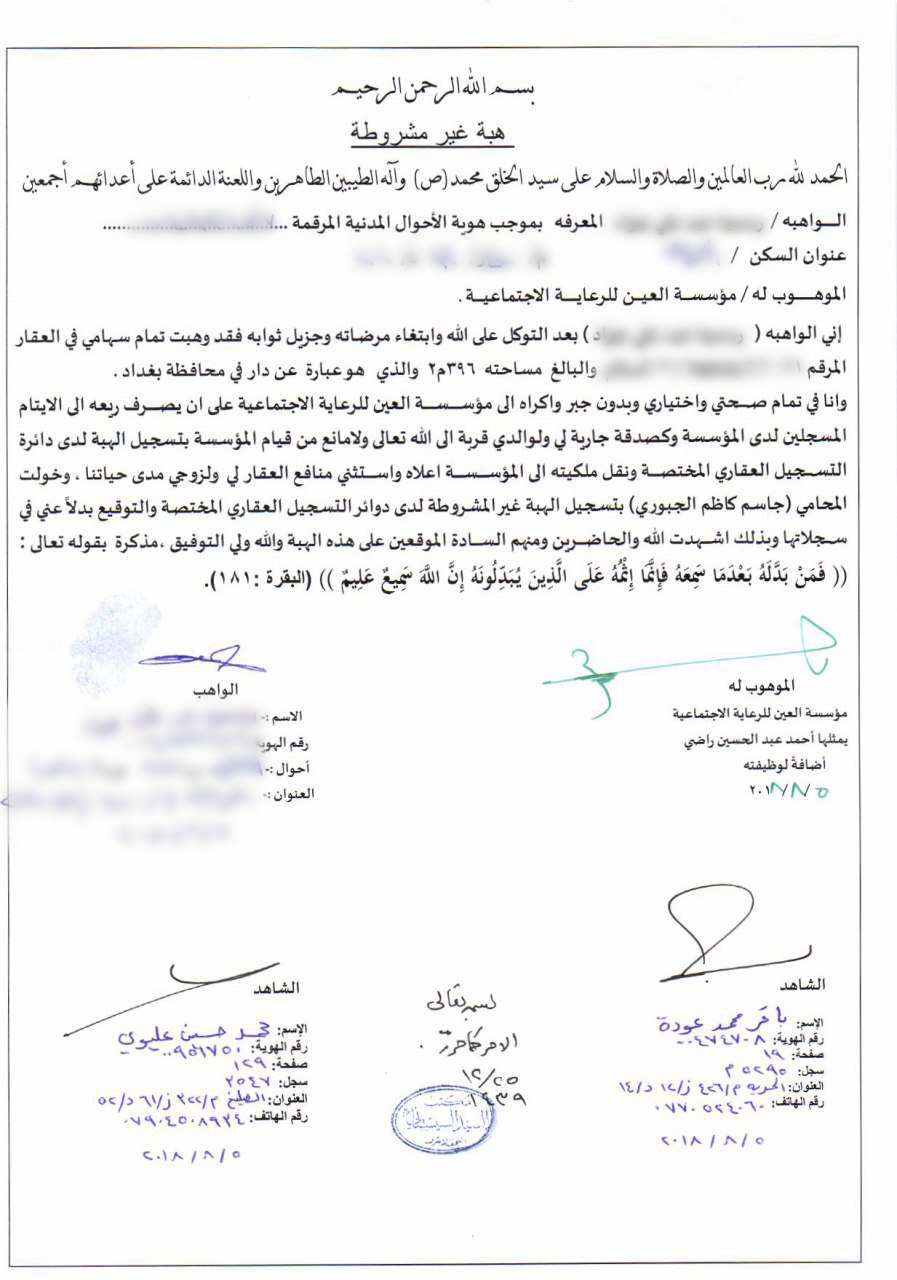 تتضمن التبرعات التي تستلمها مؤسسة العين النفقات الضرورية لاستمرار عمل المؤسسة في استقبال تبرعاتكم وصرفها في الخدمات المقدمة للمستفيدين وذلك وفق مأذونية سماحة المرجع الديني الأعلى