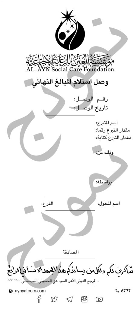 الحقوق الشرعية هي الخمس بسهميه (سهم الهاشميين [شرفهم الله] وسهم الإمام [عجل الله فرجه الشريف]). وقد أذن سماحة المرجع الديني الأعلى آية الله العظمى السيد علي الحسيني السيستاني (دام ظله الوراف) لمؤسسة العين للرعاية الاجتماعية بقبض هذه الأموال وصرفها على اليتامى المحتضنين لديها. وتتسلم المؤسسة هذه الأموال نقدًا أو عينًا إذا كان من احتياجات اليتامى الضرورية. كما يمكن للمتبرع بالحق الشرعي تخصيص مورد صرف أمواله إلى أحد أبواب عمل المؤسسة.